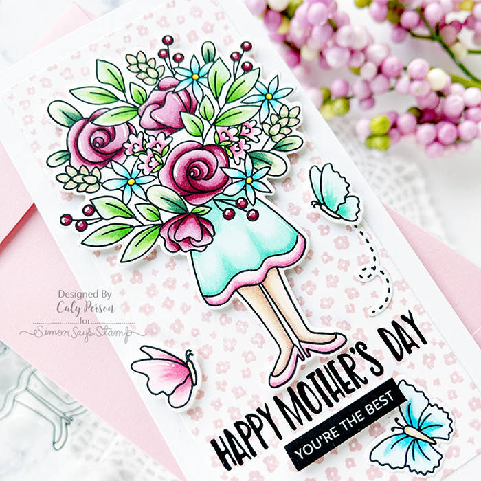 I couldn’t help but combine the Bouquet for Mom set with the Sweet Garden Background set. To make my card, I stamped the images from the Bouquet for Mom set to color with Copic markers. Then I stamped the Sweet Garden Background over a white panel.
