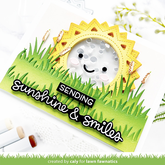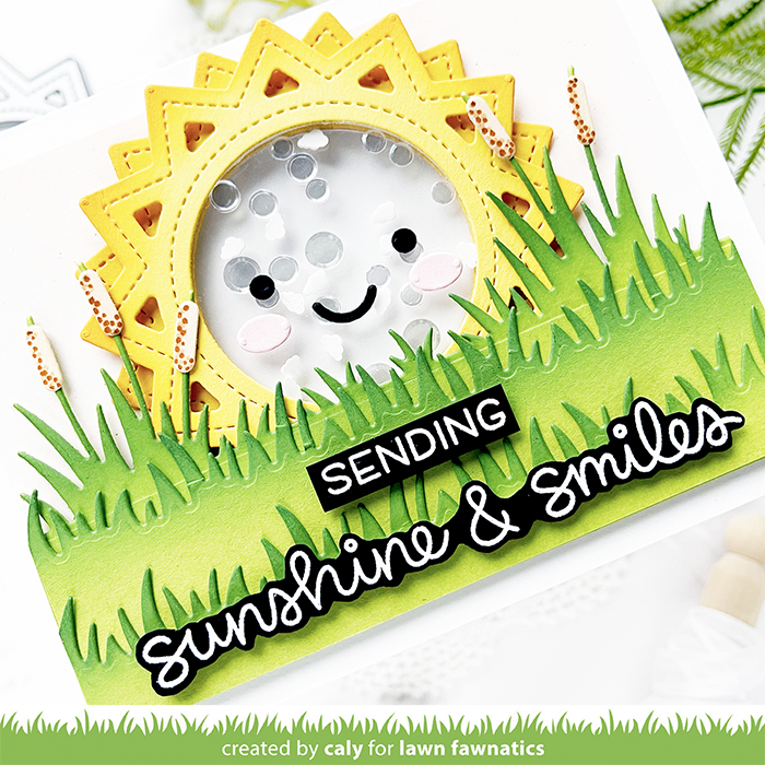 I was inspired by the image in the bottom right of this inspiration board. I hope you see what I tried to recreate with Lawn Fawn’s adorable dies! I die-cut each sun and ink-blended the rays with Wild Honey Distress Oxide Inks. I adhered acetate to each to create a shaker window and filled the space using some confetti and then sealed them in with foam adhesive.