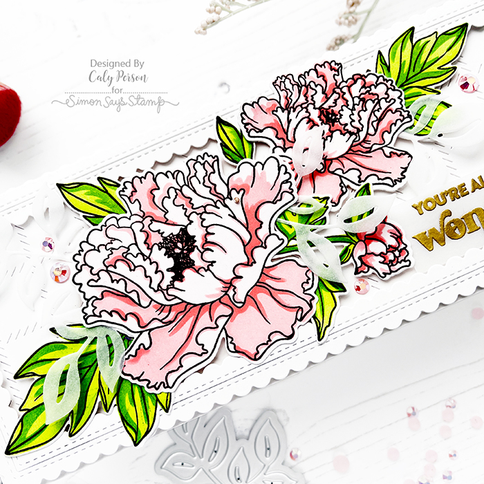 I used the Slim Diagonal Stitched Plaid and Slim Stitched Scalloped Rectangles for my slimline background panel. It’s a subtle but decorative background and frame. To accent the floral images, I also die-cut some Curvy Leaves in vellum.
