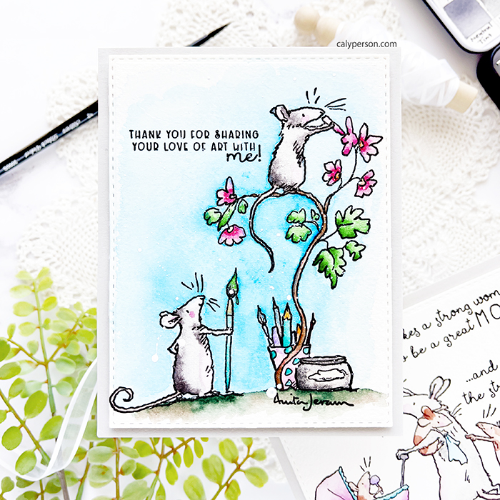 My second card is a little more colorful simply because I added a blue watercolor wash to the background. How fun is it to create your own life on canvas like these two mice are on this Love Art set? If only we could paint and draw our own lives!