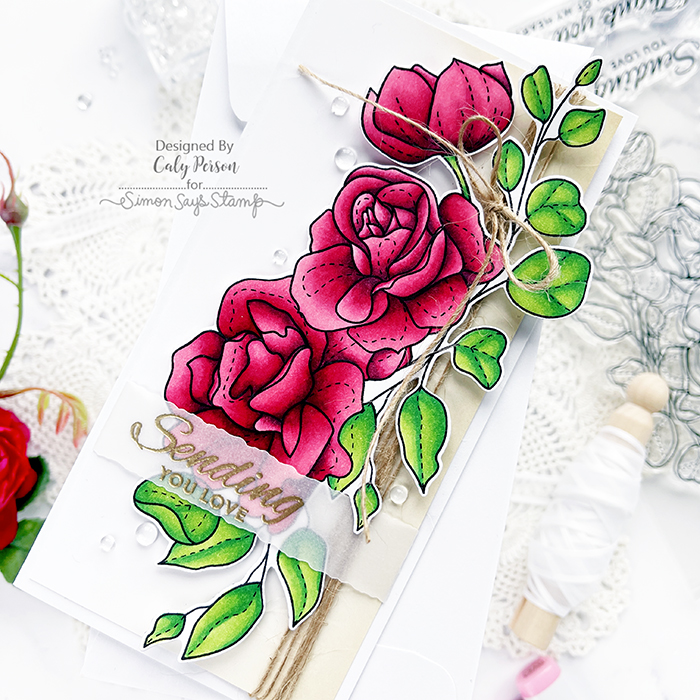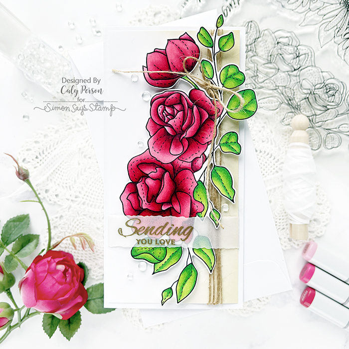 My card today features the Spring Bouquets set! There are 2 large bouquets to choose one and I chose the rose one to color for my card today. It fits a mini slimline layout perfectly but would be beautiful on a slimline card too! I stamped and colored my image with Copic markers and spent time perfecting the shading. I have to say, I got the color combination for the roses from my friend, Emily Midgett and it is gorgeous! I’ve never used a gray marker to add deeper tones before and it’s genius!