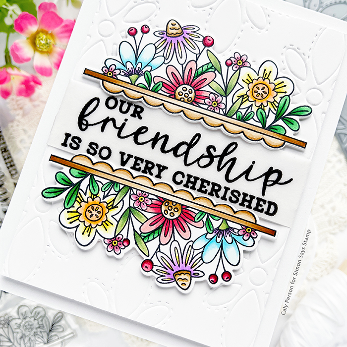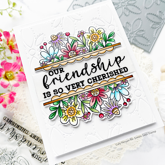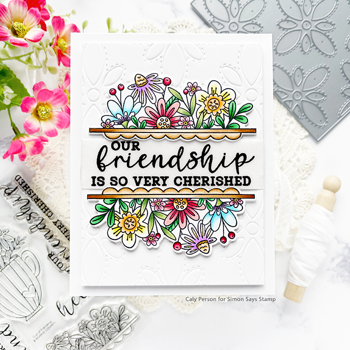Reverse Confetti’s May release launches today and I have the honor of celebrating with them! I’m sharing a card using the new set called Cup of Friendship. There are two floral image – one with floral images in a vase and the others as a split design (not sure what to call it). I used the split design for today’s card and I hope you like it!