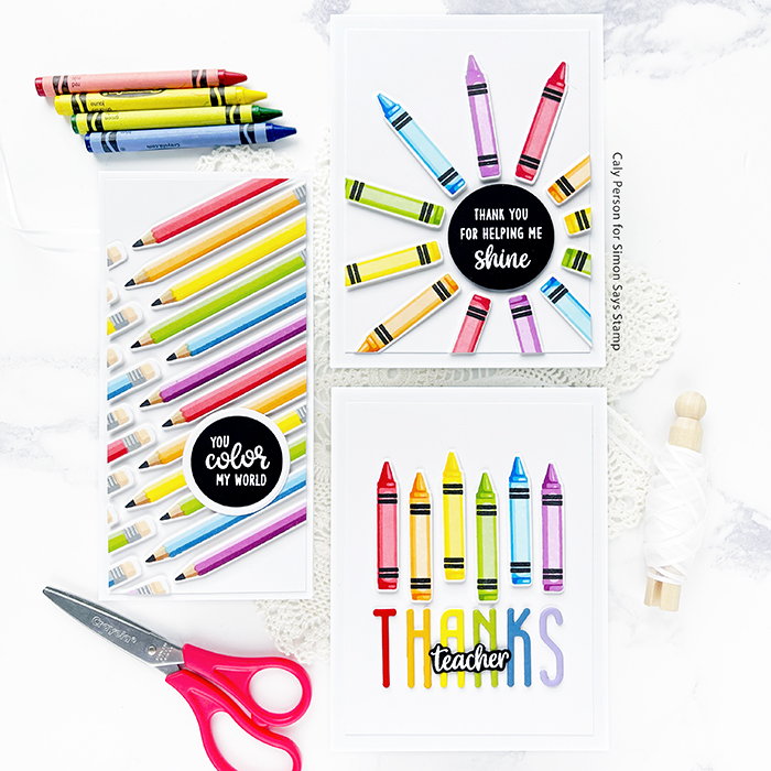 I’m here to share three fun and colorful cards today using stamped images from the Sunny Studio Color My World set. I used a few dies and the Sunny Studio Teacher Appreciation set to help out with my sentiments as well.