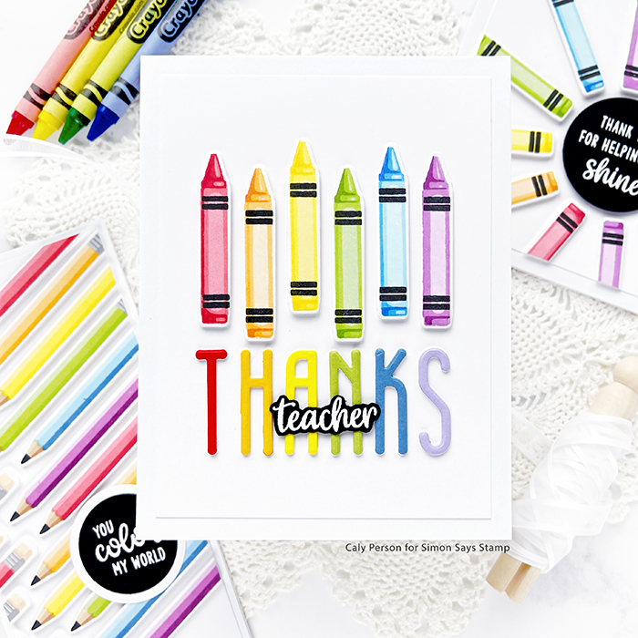 My second card is a set of rainbow crayons paired with the Altenew Tall Alpha Dies. I die-cut each letter in rainbow colored cardstock to coordinate and stacked them with 2 layers of white to give them some height. I then embossed the word teacher from the Teacher Appreciation set. I fussy cut around the word to adhere it over the tall die-cut letters.