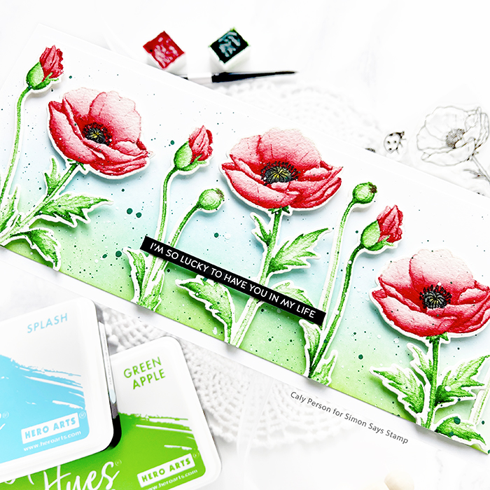 Welcome! I’m sharing a watercolor card today using the Hero Arts Poppy set. I love it when you can take a simple mini stamp set and create a full card with it. There are three poppy stems at various stages and I stamped each 3 times on watercolor paper to paint them.