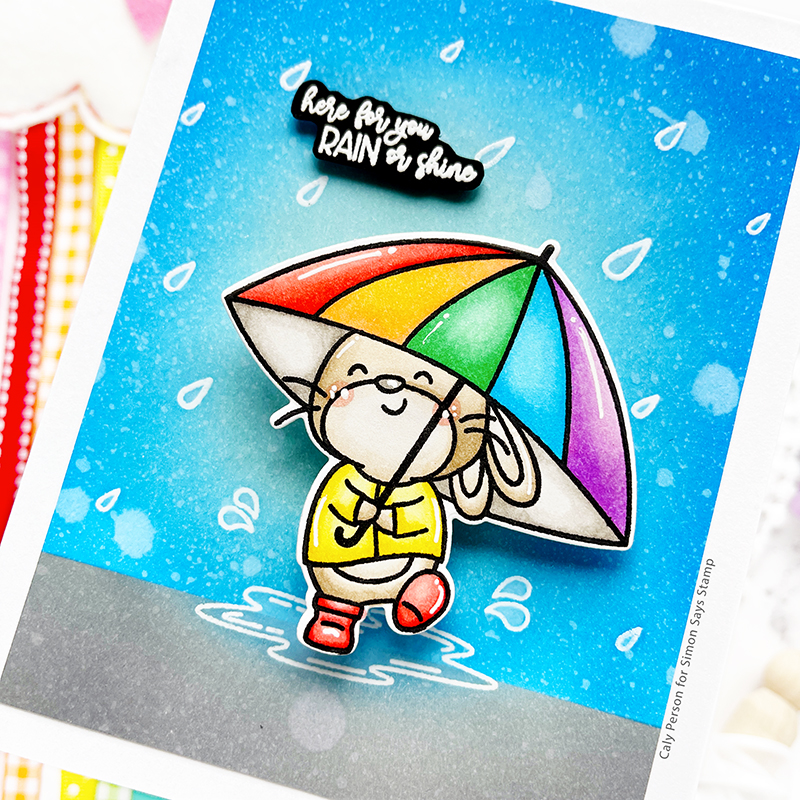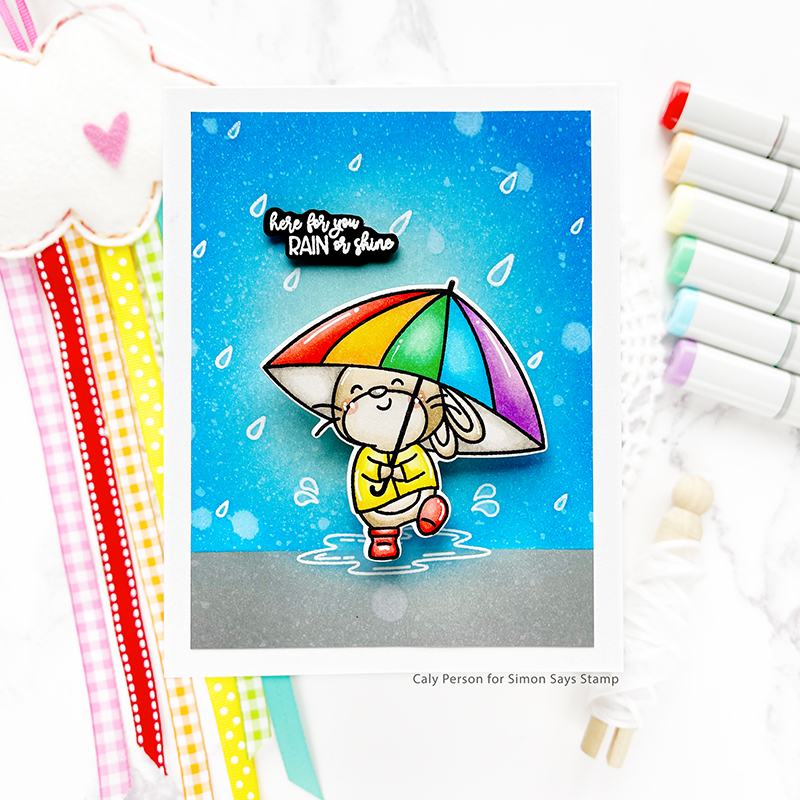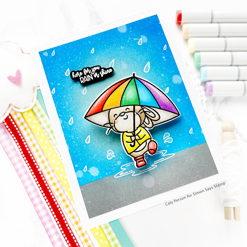 For my background, I stamped the puddle and raindrops all over using embossing ink and embossed a white panel using white embossing powder. Then I masked off the bottom section to ink-blend it with Hickory Smoke Distress Oxide Ink and the top using Speckled Egg, Salty Ocean, and Blueprint Sketch. To give it more interest, I sprayed the panel with some water to give it more texture.