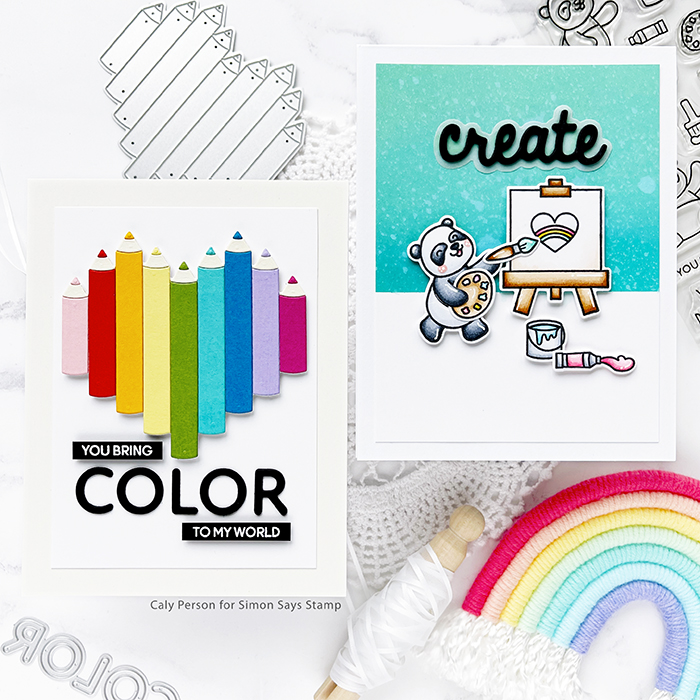 I embossed the sub-sentiments using stamps from the Pandtastic Painters stamp set, but the word “COLOR” is from the Heart Pencils Dies. I die-cut the letters from the word “COLOR” three times again to stack them for dimension. I use the negative from the die-cut to help my lay the letters back in place for perfect placement. I framed my panel over some cream cardstock that was also used for the “wood” parts of the pencil to make it more cohesive.