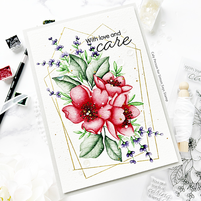 Gina K. Designs has a new product release tonight! I have the pleasure of sharing a project using the new Caring Flowers set designed by the talented Arjita Singh. It is a large 6″ x 8″ stamp set and my card today is a 5″ x 7″ set.