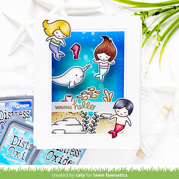 I stamped and colored images from the Mermaid For You set and a few accessory images from the You Are Sublime set for the ocean floor plants.