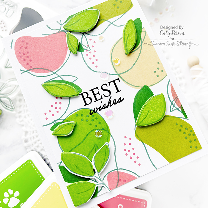 I used the dotted stamp to add color and texture to the fruit. I stamped some leaves and die-cut them to add over my panel for some additional dimension as well. When done, I trimmed my panel to mat my cardbase.