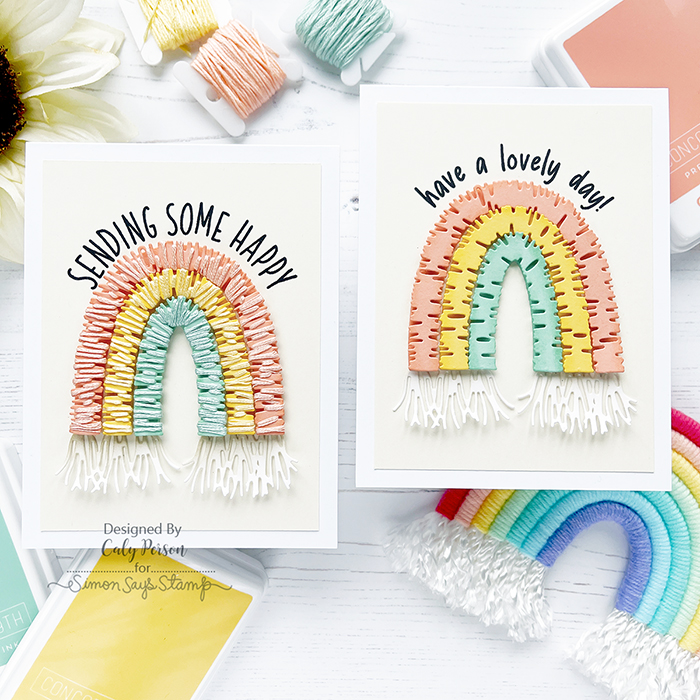 I die-cut the rainbow bands using C9 cardstock, ink-blended it give it some shading, then wrapped the top bands with matching embroidery floss. The coordinating C9 cardstock and ink colors used today are Grapefruit, Buttercup, and Sea Glass. I used a bit of Wheat ink on the fringes too. I made a second card showing you what it looks like without embroidery floss too.