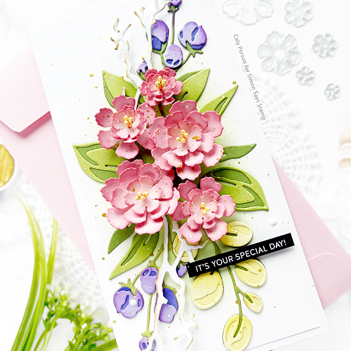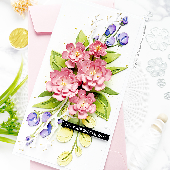 I used Simon Says Stamp cardstock to die-cut all the pieces and inked them with coordinating Distress Oxide Inks (Mowed Lawn, Worn Lipstick, Gathered Twigs, Wilted Violet, Fossilized Amber). For the purple, I also used a Copic marker (BV13) to add a darker shade. I pieced it all together and adhered the pieces together using distress collage medium. For the 3D flowers, I pierced a hole through all of the centers and threaded the stamen through them and glued the ends to the back to hold it all in place with hot glue.