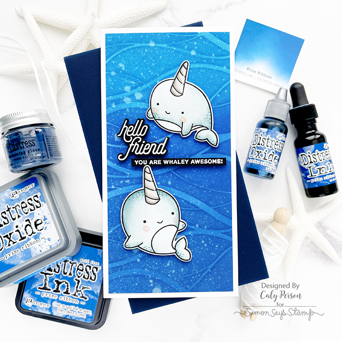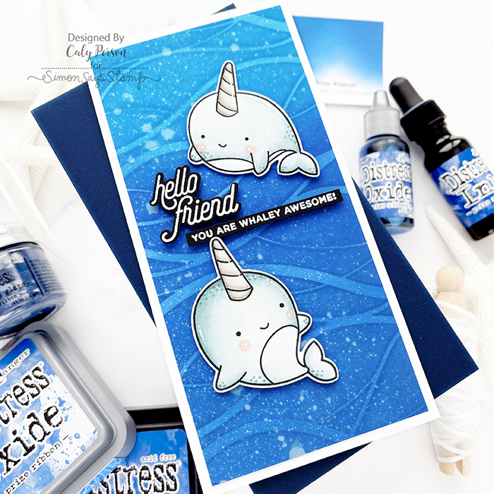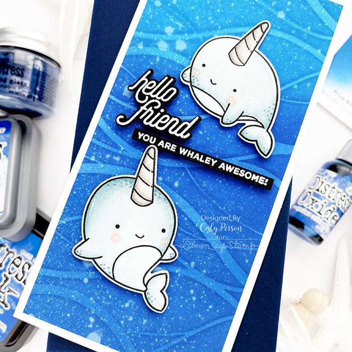 To give the ink-blended panel some texture, I sprayed it with my Distress Sprayer. I set the panel aside to color some Narwhal Friends to create a mini slimline card. When I was done coloring, I die-cut the images and added some white gel highlights.
