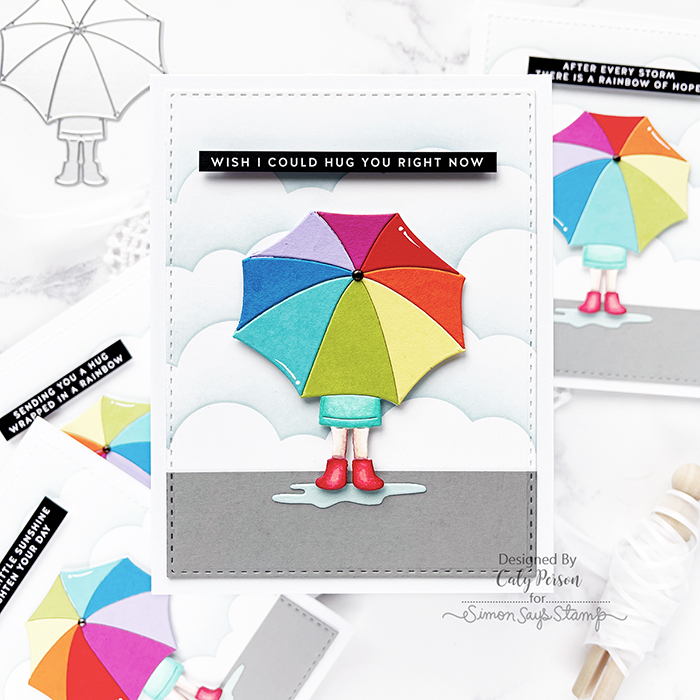 Before attaching my girls, I inserted a brad at the center of my umbrellas. The little piece of cardstock that was there is tiny and I felt a brad made it much more interesting. To finish my set of cards, I used various sentiments from the Reverse Sunshine and Rainbows Sentiment Strips set. They have great sentiments to compliment these Rainy Days dies!