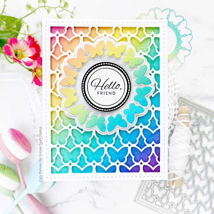 I have another rainbow card to share today using Waffle Flower products. I used the Outline Butterfly Panel with the Circle Butterly Shaker Die to create colorful layers.