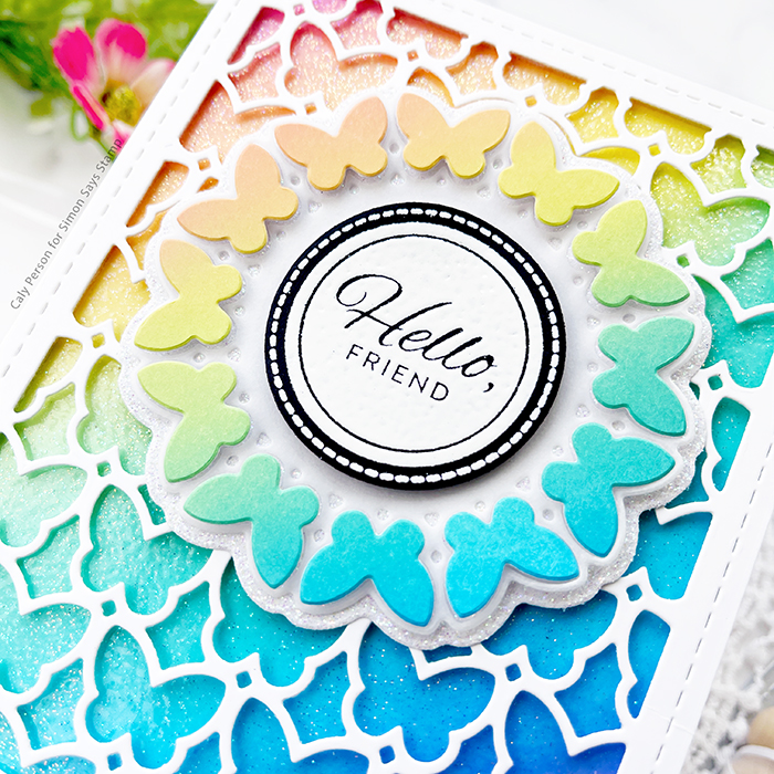 To start, I ink-blended a white panel with Distress Oxide inks at a diagonal to create a rainbow: Picked Raspberry, Squeezed Lemonade, Peacock Feathers, Salty Ocean, Wilted Violet. I wanted to give it some sparkle but didn’t want to wait for it to dry if I used a paste, so I applied embossing ink all over it and used Sparkle Embossing Powder, that way, I could heat set and it would be dry instantly. Next, I die-cut the Outline Butterfly Panel in white to layer over the top using foam adhesive for dimension.
