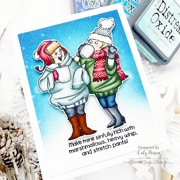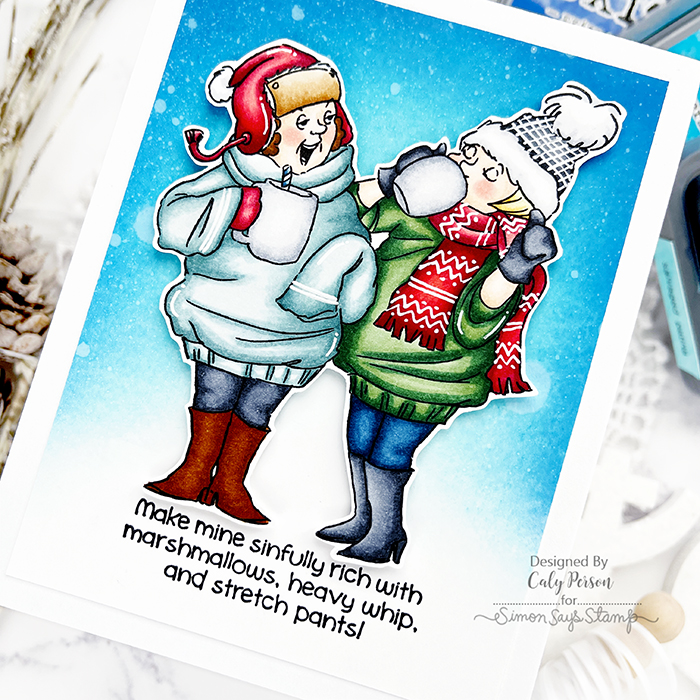 Before adhering the fussy-cut image with foam tape, I stamped my sentiment to help “ground” my image. I used a white gel pen to add some texture and decor to the sweaters and hats. I hope you like this!