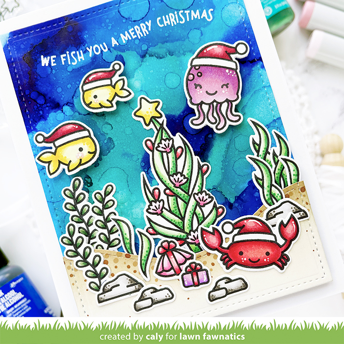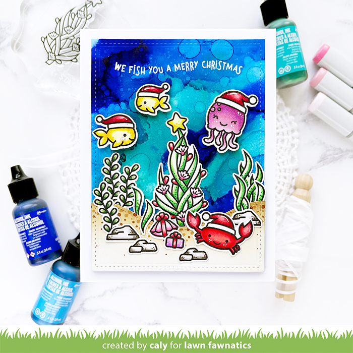 For my card today, I was inspired to use alcohol inks to recreate a similar ocean look. I am so not ready for Christmas, but I was flipping through my Lawn Fawn bins and the Christmas Fishes set was perfect for the card I envisioned.