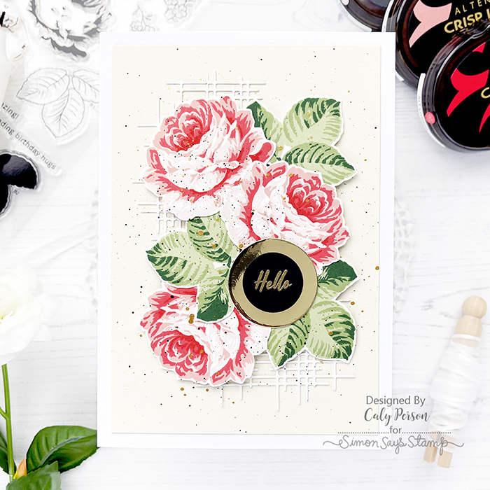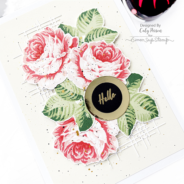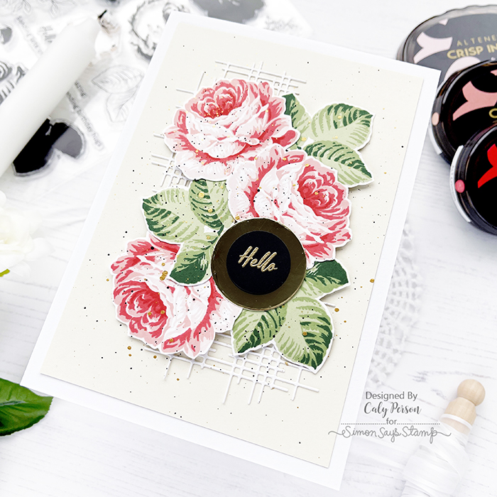 My card today is a 5″x7″ card – I wanted lots of room for these beautiful blooms. I used the Linear Crossroads die to give my card texture as well as with gold and black paint splatters.