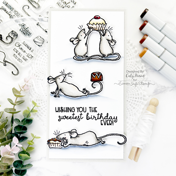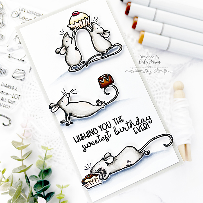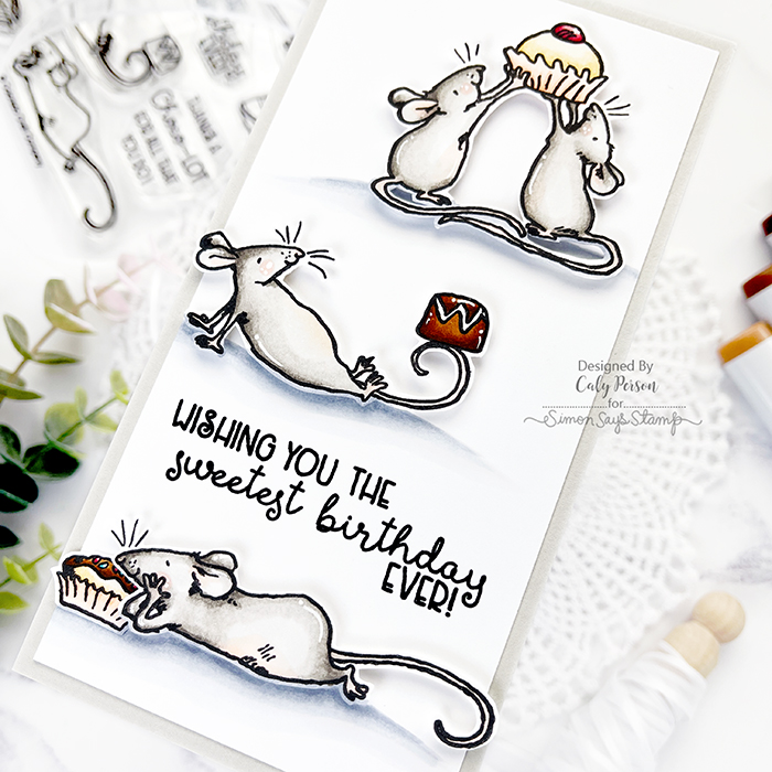 I stamped my sentiment before matting my card panel over a piece of Fog cardstock and attaching the mice with foam adhesive.