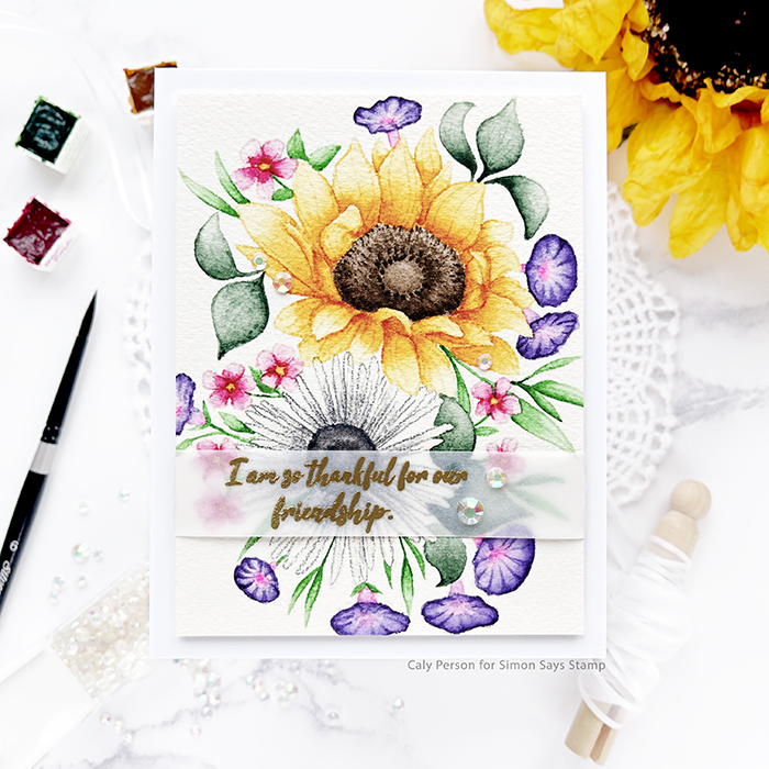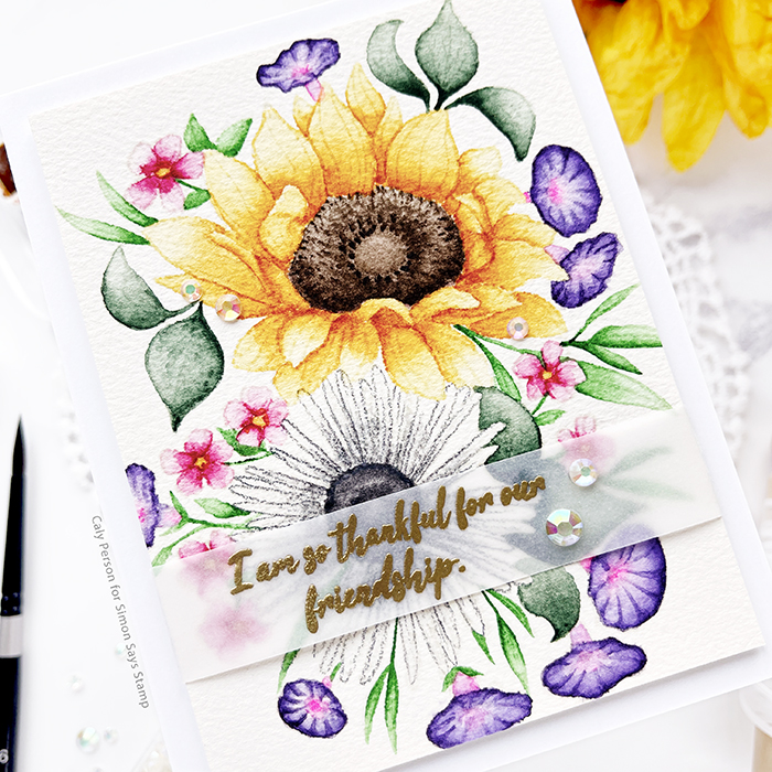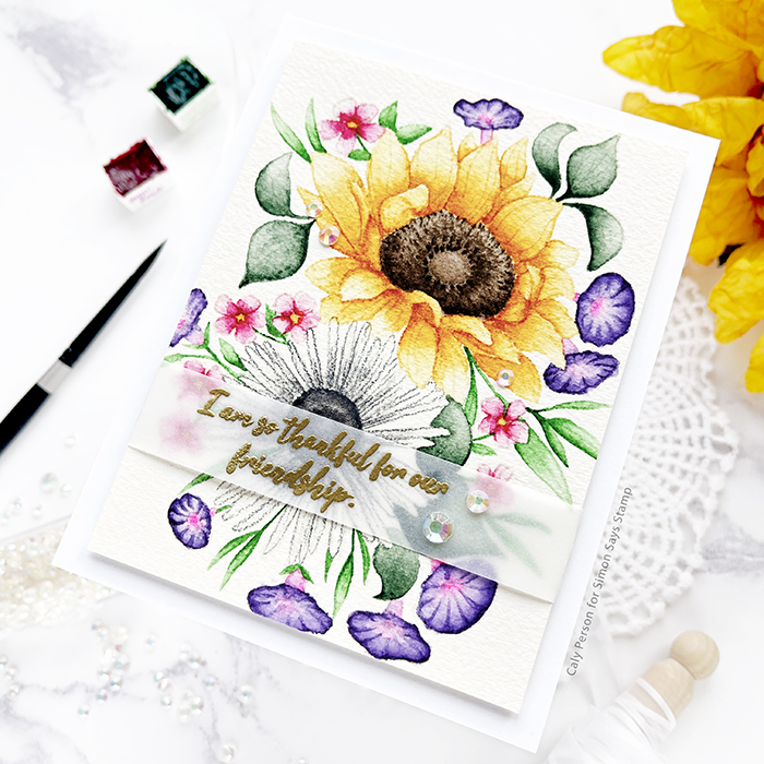 I stamped and embossed a sentiment in gold over vellum and wrapped it around the bottom third of the painted panel – strategically over the daisy I’m not proud of. 😂