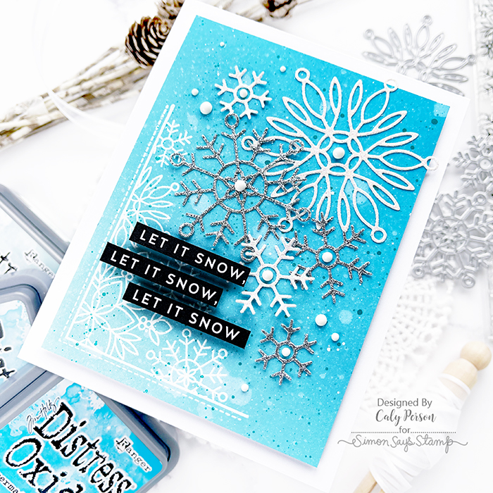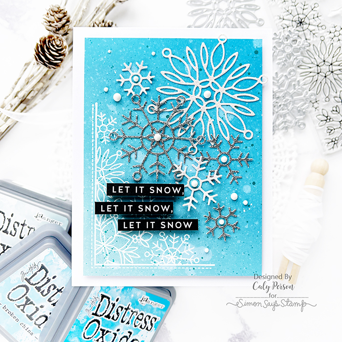 I embossed an image from the Snowflake Edges stamp set on a white panel and ink-blended it with Distress Oxides for some resist-ink-blending using Mermaid Lagoon, Broken China, and Speckled Egg. I splattered this panel with water, white and blue paint for texture, then set it aside to die-cut my snowflakes.