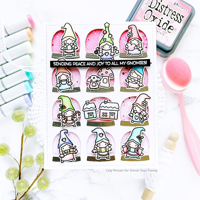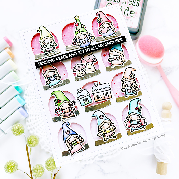Most of the images are from the Little Girl Gnome Agenda set, a few from the Oh Gnomie Tree set, and the sentiment is also from the Oh Gnomie Tree set. I stamped and colored these adorable images in soft Copic colors.