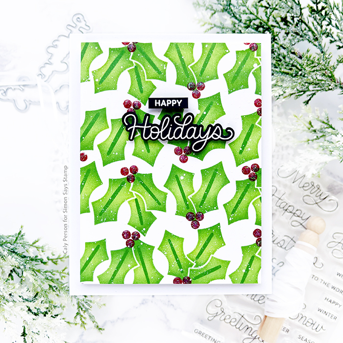 My first card uses the Layered Holly stencil set. There are 3 layers, one for the holly leaves, one for the veins of the leaves, and one for the berries.