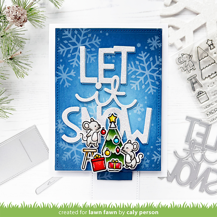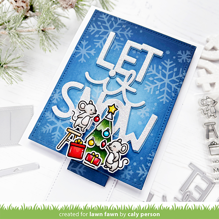 I used several new products from Lawn Fawn’s latest release to create a fun interactive card. The new Flippy Flappy dies creates an extra component to any card. For my card today, it’s an entire scene using the Merry Mice set.