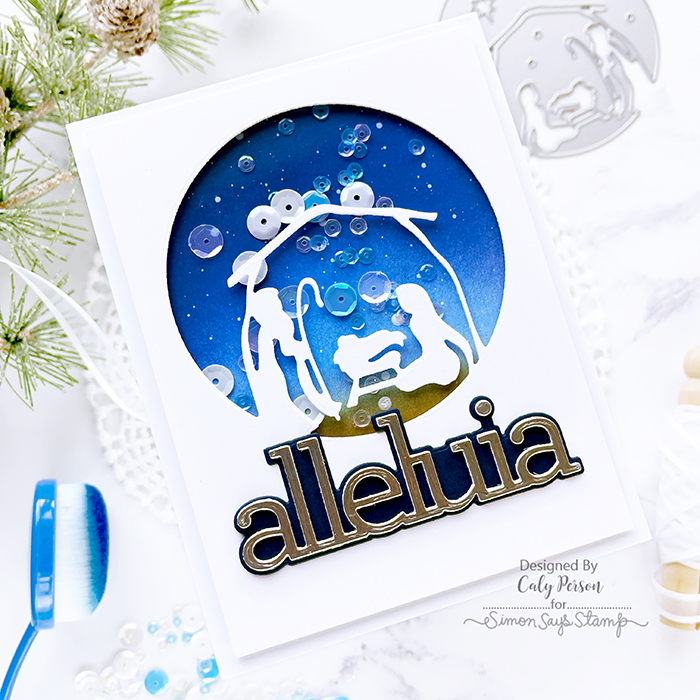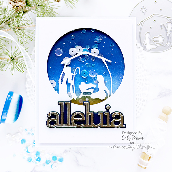 To create today’s card, I used the First Night die and centered it on top of a white panel. It creates a window. You can also cut a circle frame by using another circle die that you have, but I opted to create a shaker card. I adhered some acetate under the opening of this nativity scene to turn it into a shaker window.