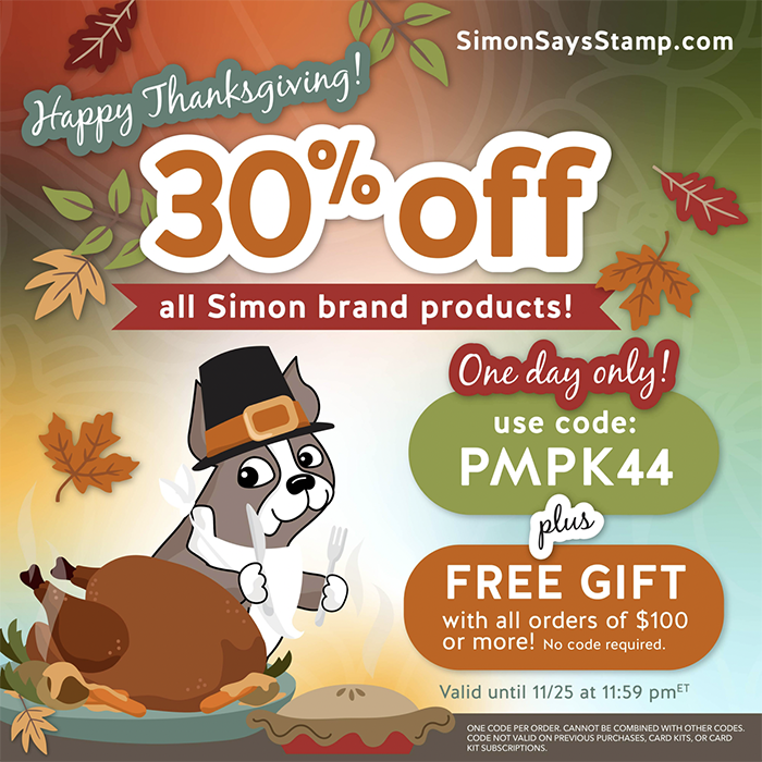 Simon Says Stamp is running fabulous promotions to celebrate Thanksgiving!!! Unlike yesterday’s mini release, the Yeti For Christmas set is FREE with a purchase of $100 or more! It’s so cute! You can also purchase the coordinating dies – because we all love coordinating dies! Not only this this amazing, but all Simon Says Stamp-branded products are 30%. Now’s your chance to get that rainbow set of PETs or their cute holiday zipper pouches!