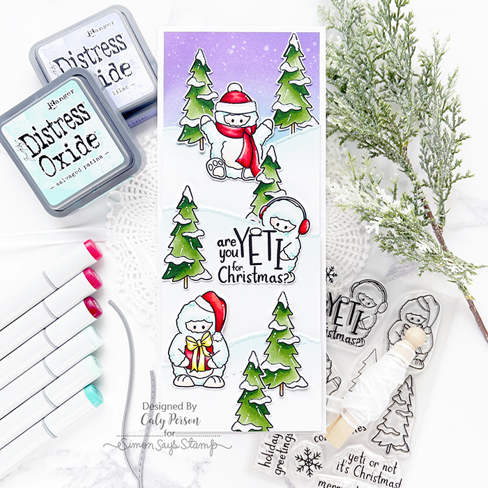 There are three sweet yeti images so I stamped them all to color. There are two styles of trees- one with snowcaps and one without. I stamped the snowy tree several times to color for lots of foliage for my slimline card. I colored with Copic markers and added white gel highlights to give them more interest. I also used a Sakura Quickie Glue Pen to adhere some Unicorn Dust for lots of sparkles on the trees and the yeti’s hats.