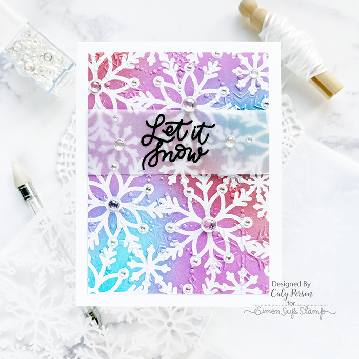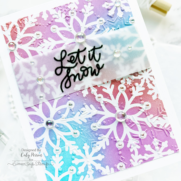 Next, I stamped a sentiment over vellum. I used a black pigment ink and embossed it with clear embossing folder and wrapped it around the top 1/3 portion of my card. I finished by adding some iridescent bubbles over snowflakes throughout.