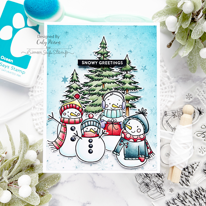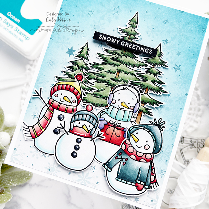 I adhered my trees directly to the ink-blended patterned paper panel and they layered my snowmen in front of the trees to create some perspective. I used foam adhesive on the two foremost snowmen too. My sentiment is stamped and embossed from the Warmest Wishes stamp set.
