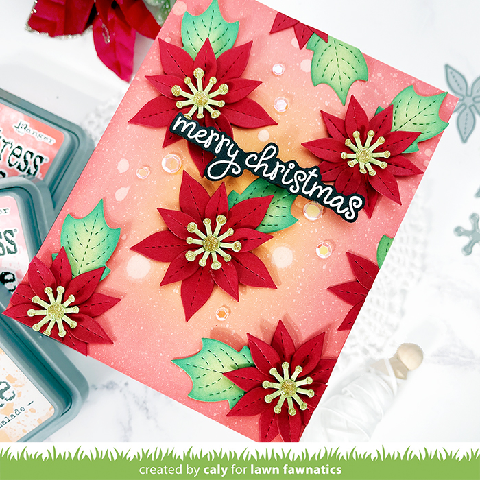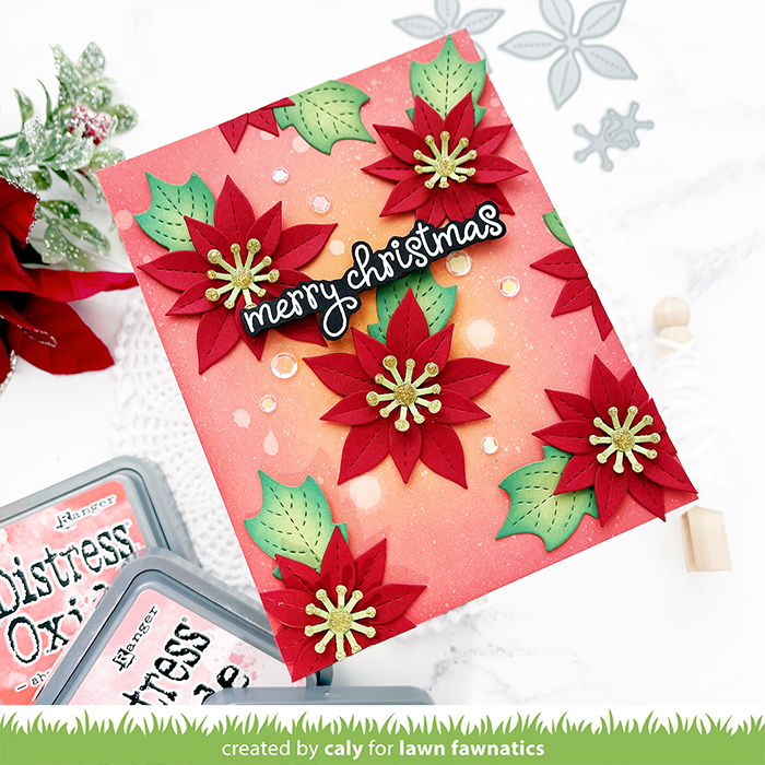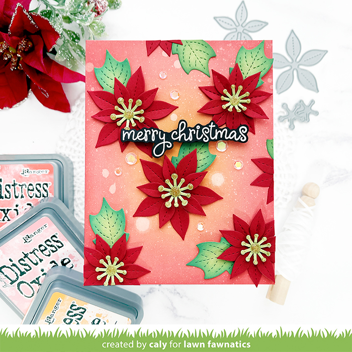 To give my flowers more interest, I ink-blended the poinsettia with Lawn Fawn Cranberry Dye Ink and the leaves with Lucky Clover Distress Oxide Ink. Once all the ink-blending was done, I pieced them together using liquid glue and set them aside to work on a background.