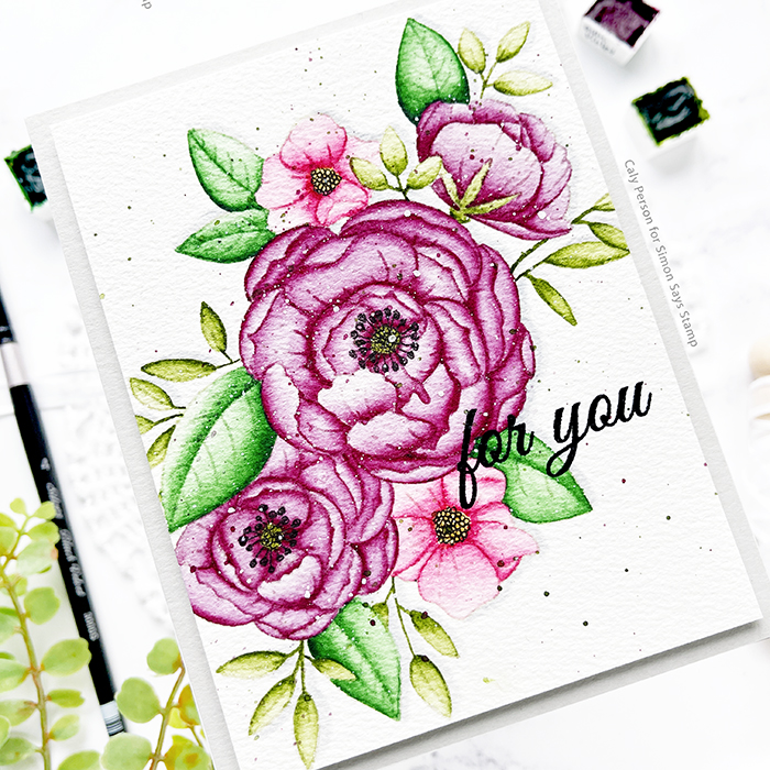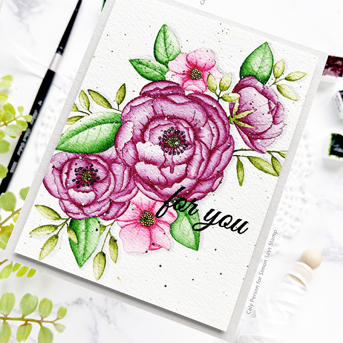 I added some details back into the flower centers with a black pen and then splattered the panel with dark green paint and purple paints I used on the bouquet. For the sentiment, I stamped simply with a black pigment ink and embossed it with clear embossing powder.