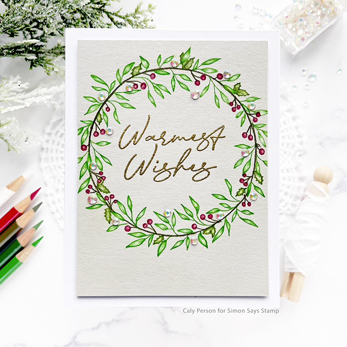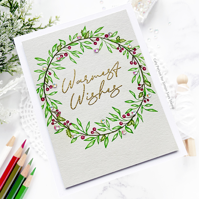 My second card features the Holly Wreath set – designed by Hannah Drapinski. This wreath is delicate and large, but the details are small so I opted to used colored pencils. I stamped again with a light ink and colored for a no-line look.