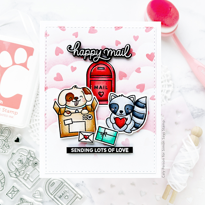 My first background is ink-blended with Blush ink. I ink-blended the Scattered Hearts stencil first, then went over it with a cloud border stencil using the Build A Rainbow stencil from Simon Says Stamp. I saw Nichol Sphor do something similar and wanted to try it – she is so good with layering backgrounds!