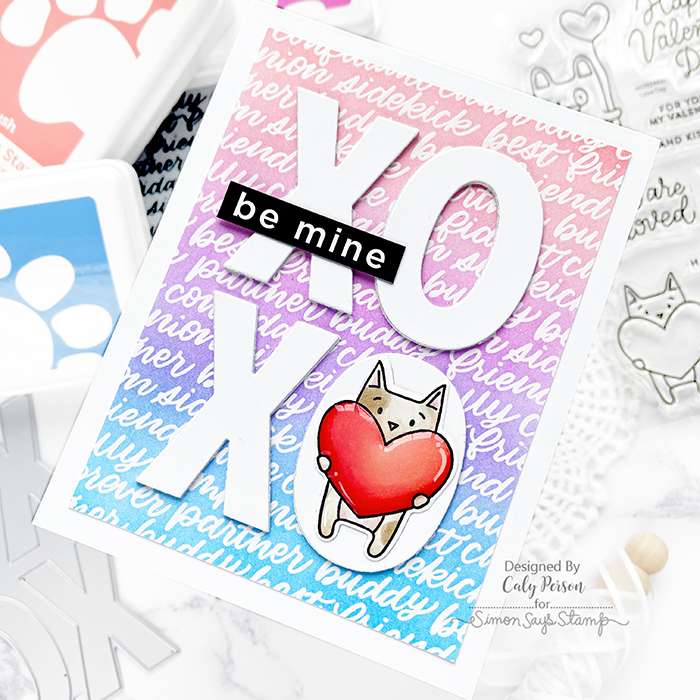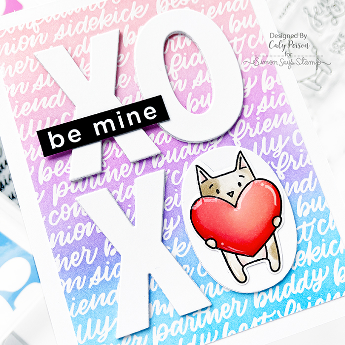 I started by stamping the Hand-lettered Friends background stamp and embossing it in white to ink-blend with Pawsitively Saturated Ink (Blush, Cadette, Sweets). Next, I die-cut the Big XOXO three times and stacked them for dimension. I used the negative to help me line them up perfectly over the background by in-laying the stacked letters.