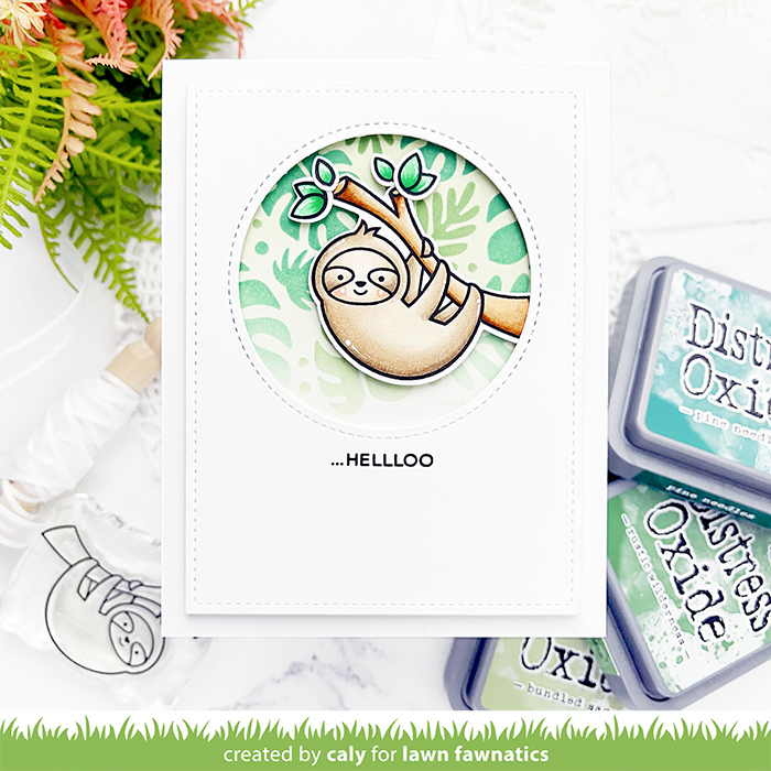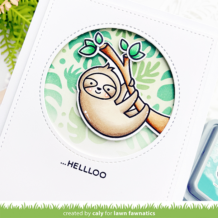It helps to have a cute image to work with so I used a mini set called Hang In There. That sloth is adorable! I stamped and colored him and his branch and leaves with Copic markers.