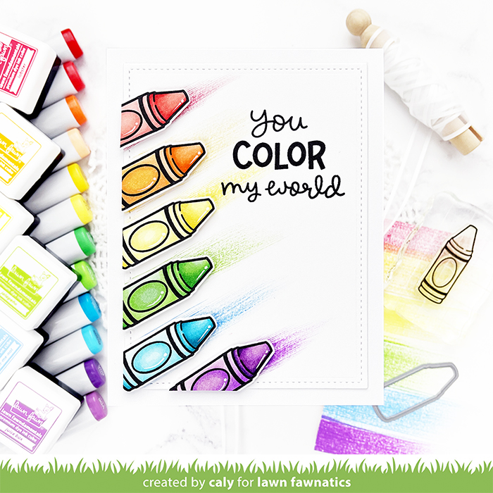 To make a colorful background, I used Lawn Fawn Mini Ink Cubes in Lobster, Carrot, Lemonade, Jalapeno, Forget-Me-Not, and Juice Box. I used one of the corners of each ink cube to swipe at an angle.  Them I used the largest of the Small Stitched Rectangle Stackables dies to die-cut a stitched panel for my crayons.