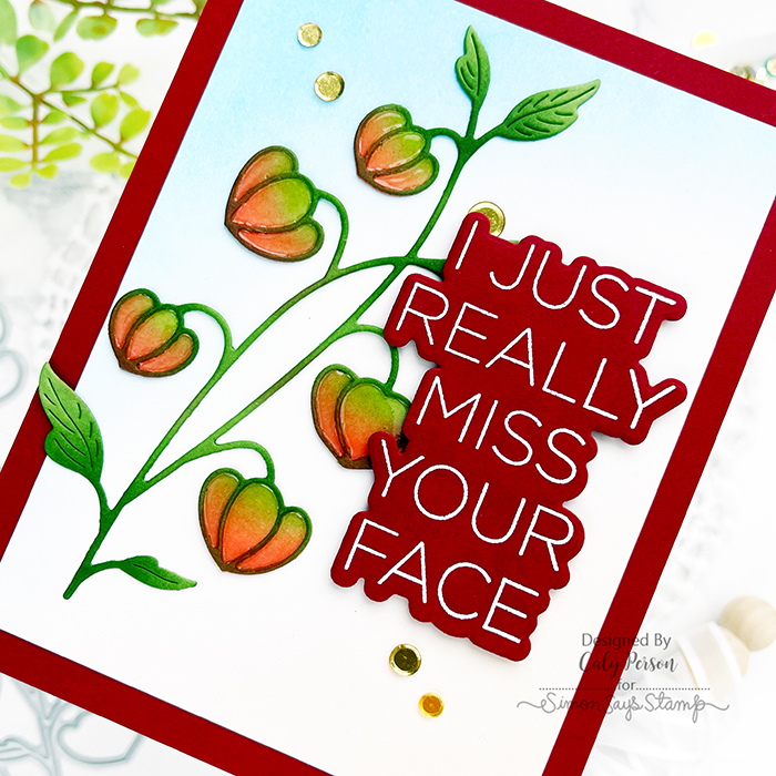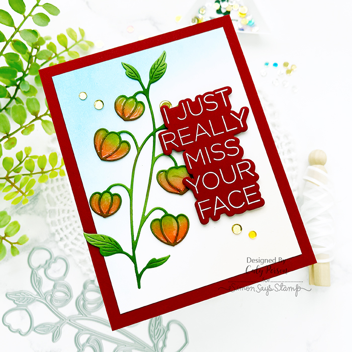On a white card panel, I ink-blended Melon and Cadette PSI at a diagonal before adhering my Chinese Lantern Stem. I flooded the lantern pods with Glossy Accents to give them some shine. Next, I worked on my sentiment.