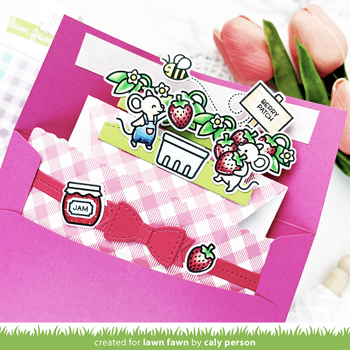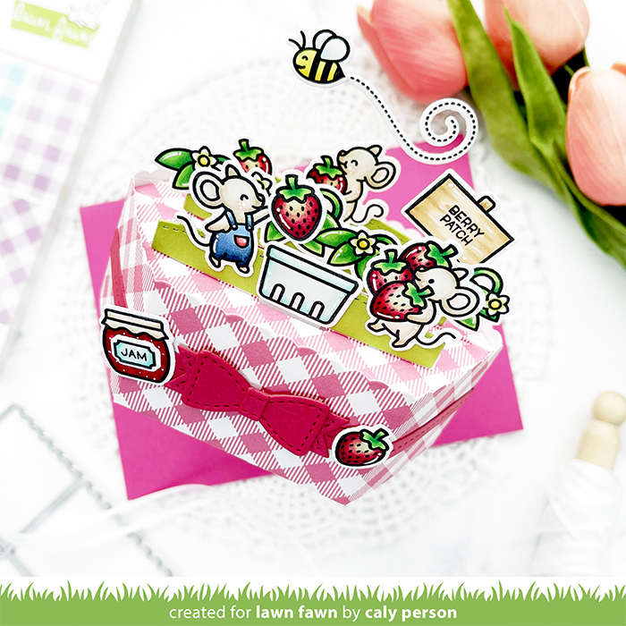 My Platform Pop-Up die is die-cut from the new Gotta Have Gingham Rainbow Petite Paper Pack. There are lots of pretty colors, but I used the color that most resembles strawberries!