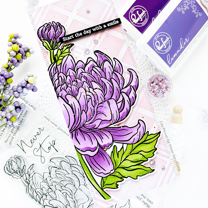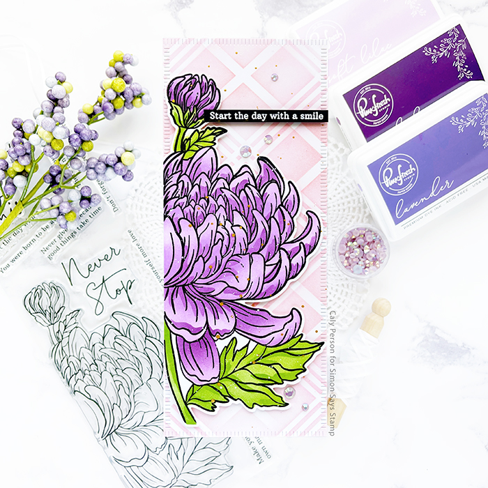 I started out with the Chrysanthemum Slimline stamp, die and stencil set. This beautiful image was illustrated by Emily Midgett so I just had to use it! I stamped and and ink-blended my card with Pinkfresh Studio Inks (Grassy Knoll, Olive, Soft Lilac, Lavender, Regal Bliss). After ink-blending, I die-cut the image to work on the background.