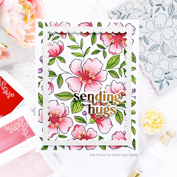 My second card uses the Delicate Floral Print stamp and stencils set. I stamped my image just like I did before and ink-blended using the same colors, with a more intense hand for the pinks (Grassy Knoll, Olive, Lavender, Coral Reef, Passion Fruit, Berrylicious).