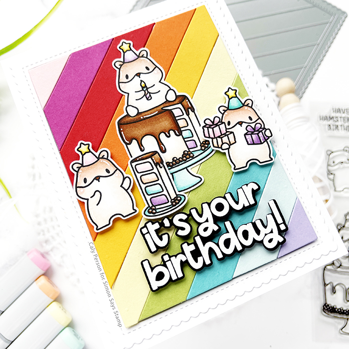 Today’s card uses products from Mama Elephant’s February Release. These Celebration Hamsters are just too cute – I just love their chubby faces! I stamped and colored them with Copic markers.