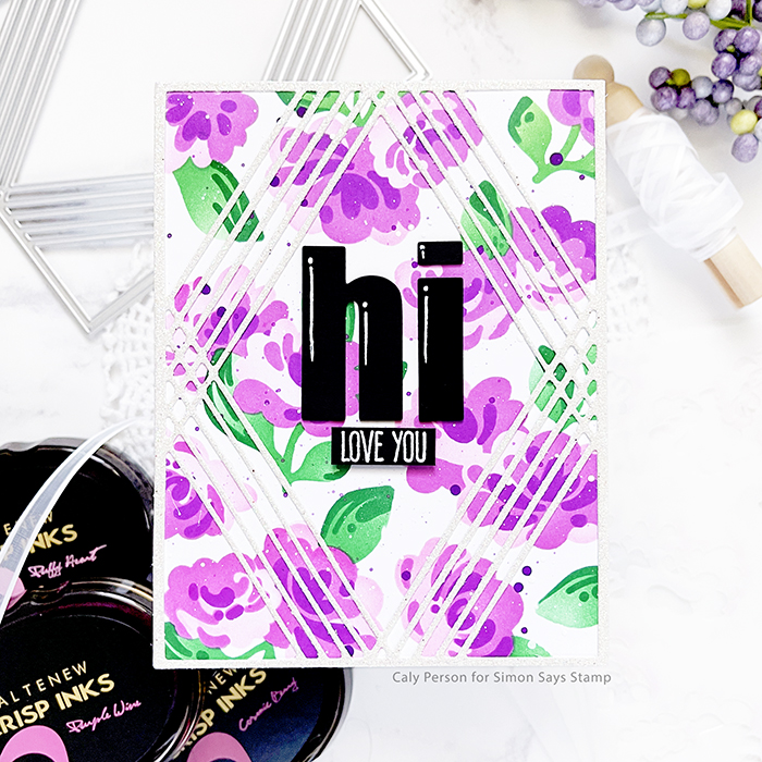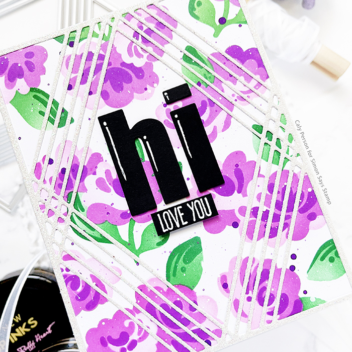 Stenciled backgrounds are single-layered. To give my card more interest, I die-cut the Diamond Frame using white glitter cardstock. I adhered it directly over my stenciled background using liquid adhesive.
