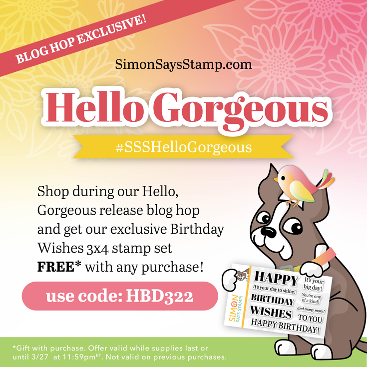 Welcome to Day 1 of the Simon Says Says Hello Gorgeous Release Blog Hop! We’ve got so much inspiration for you today and hope you’ll check back for Day 2 tomorrow starting with the Simon Says Stamp Blog. If you’d like to see even more inspiration, be sure to check out the Hello Gorgeous Gallery!