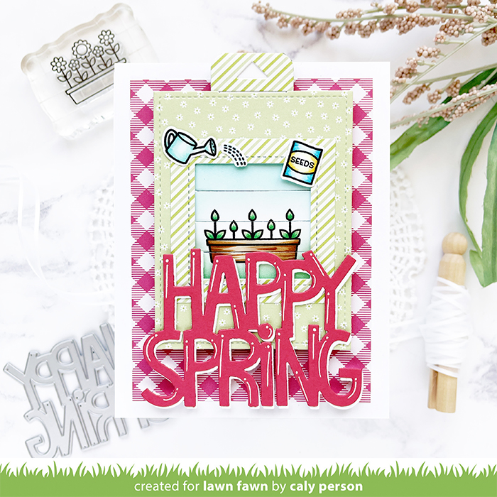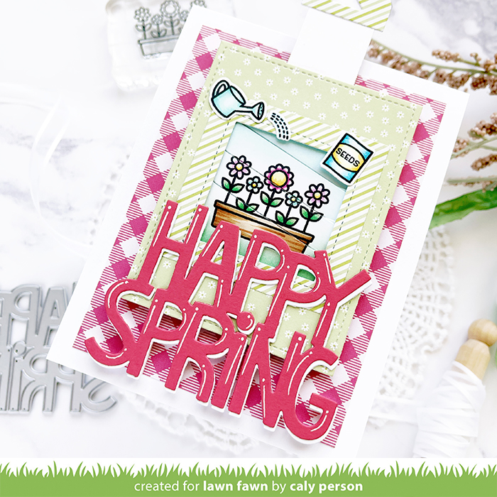 This mechanism is so fun! I used fun new patterned papers from the release using the Gotta Have Gingham Rainbow Petite Paper Pack and Flower Market Petite Paper Pack. The sentiment is die-cut from the Giant Happy Spring Lawn Cuts.