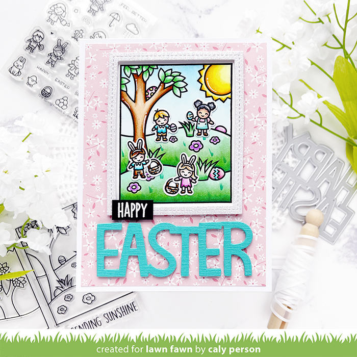 It’s Day two of March Inspiration week for Lawn Fawn. I’m sharing a card using the Tiny Spring Friends, Window Scene Spring and Giant Happy Easter die. Lots of coloring, but the spring window scene is precious! I combined images from both stamp sets.